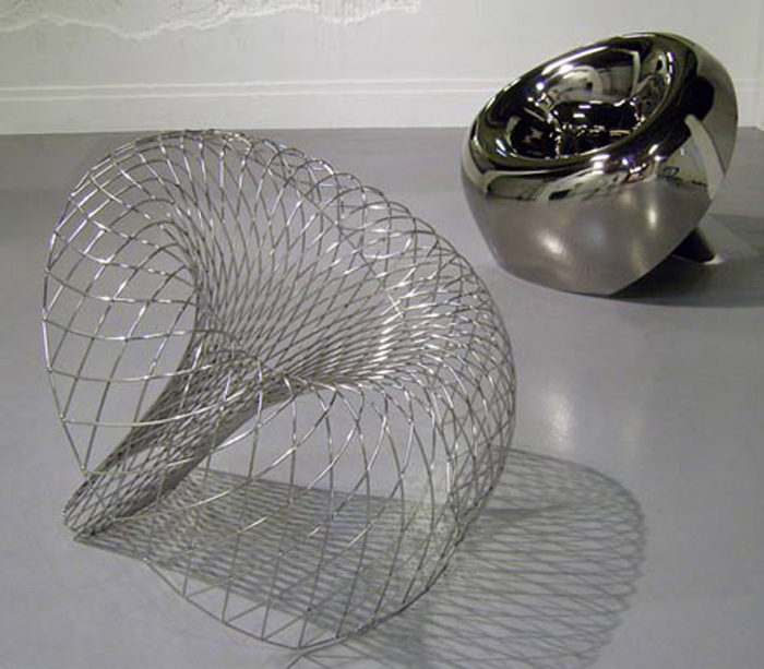 INSPIRED by the reverberation of sound, the chair flows outward before returning back to itself. The dynamic, conical design is hand-made in London from gleaming nickel-plated aluminium. "The highly reflective surface of the Reverb's design emphasises the tapering of the chair and the transition from the curvaceous seat to the elliptical vortex of the back," explains the designer.