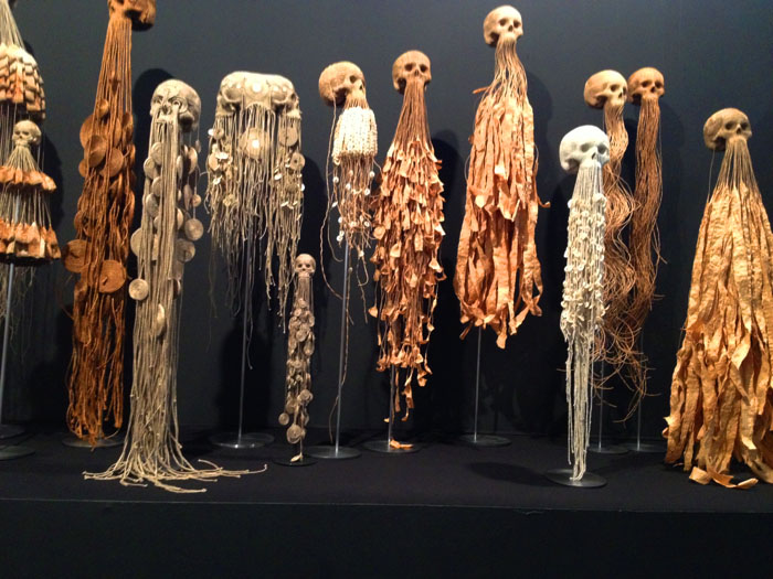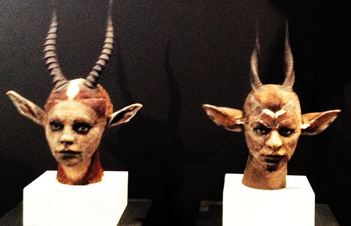 This second exhibition showcases sixty artists work that explore the boundaries of modern art and pop-surrealism, often showing a macabre side to contemporary creativity. Works include the Alien sculptures of HR Giger, the finely-woven macrame heads by Jim Skull and Kate Clark's animal-humans (see photographs below). One of twenty five American artists, Brooklyn sculptor Kate Clark exhibits her busts of creatures that appear to be young bucks with human eyes. She is interested in showing the different 'animalities' within us. However, Clark is not 'outside' the art establishment but was trained at Cornell and the Cranbrook Academy.