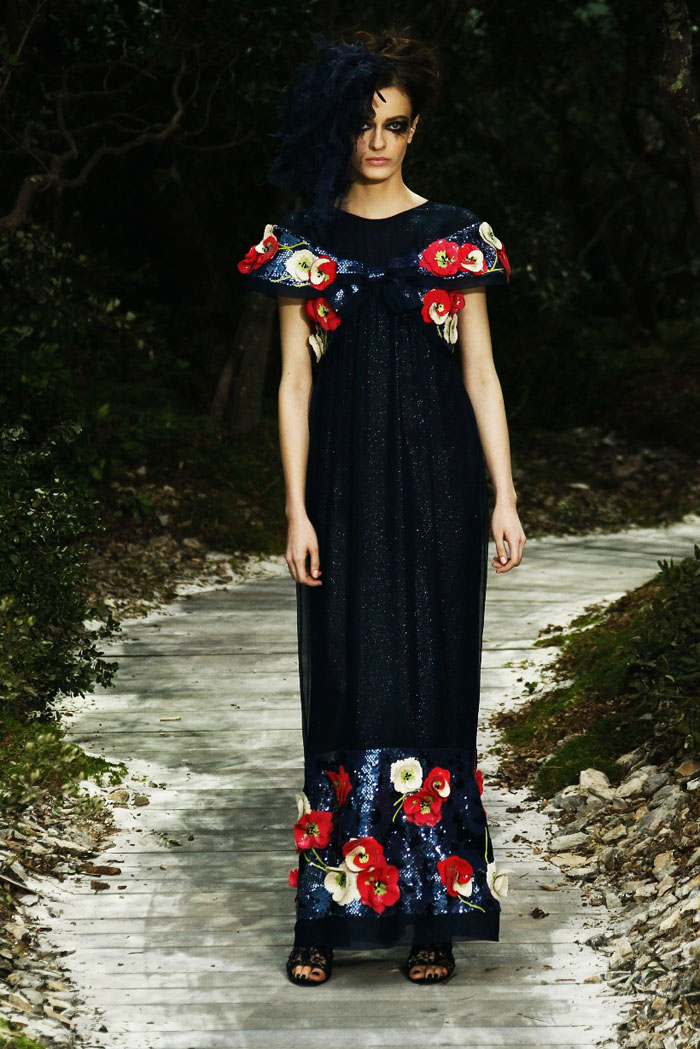 “I love embroidery," explained Lagerfield. "And I love the idea of making embroidery like a print. It is the top of sophistication. Nobody would think that the flowers could take two thousand hours to make. But the skirts are very light even though they have half a million little sequins on them."