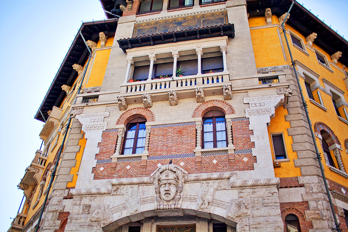 The apartment buildings are decorated with Romanesque loggias, Liberty style ceramic tiles and Roman lion's heads and classical heads.