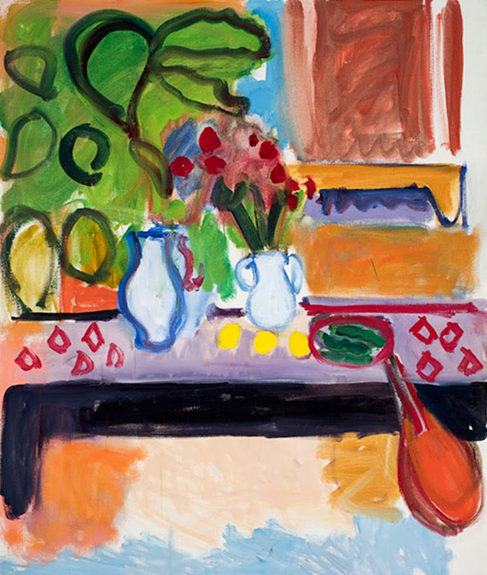 | Still Life with Vase of Flowers, Lemons, Chair and Guitar 1989 Oil on linen, 34 x 40 inches |