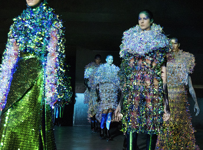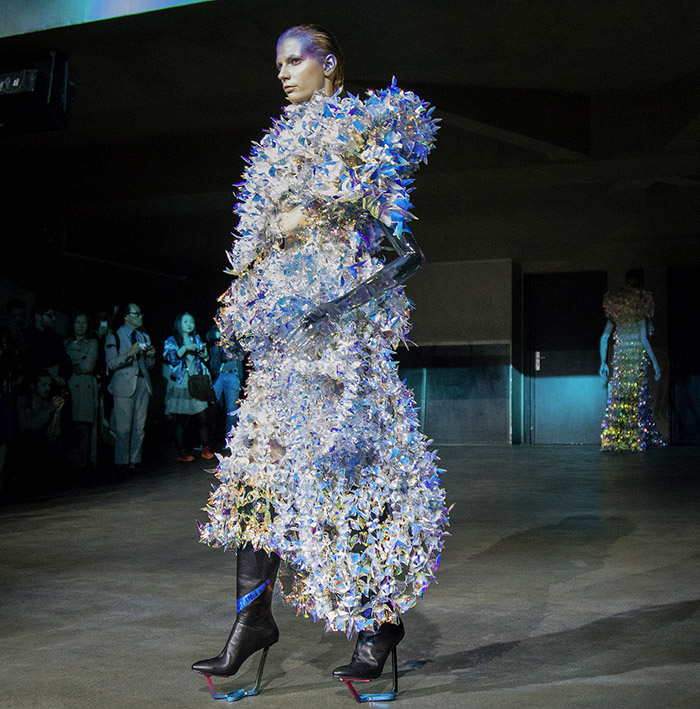 | Shimmering, holographic origami with transparent, faux arms at Yuima Nakazato's innovative presentation in Paris. Cover picture and all photographs by Elli Ioannou |