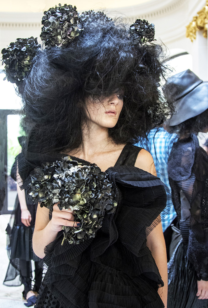 His latest collection in Paris at the grand and elegant Peninsula Hotel, opened with nocturnal sounds that hinted at the theme of the all-black show entitled Eclipse. Models with blowsy and bouffant Elizabethan-style hair by Kevin Murphy combined with pale make-up came down the runway with folkloric style leather-clad shoes. The models seemed like birds with exotic, ruffled plumage. There were leather ensembles of tops and layered skirts, alongside elliptical-shaped dresses using fabric constructed to appear like a large black rose. The atmosphere of the collection suggested 18th Century Valkyries with bold shapes and big hair.