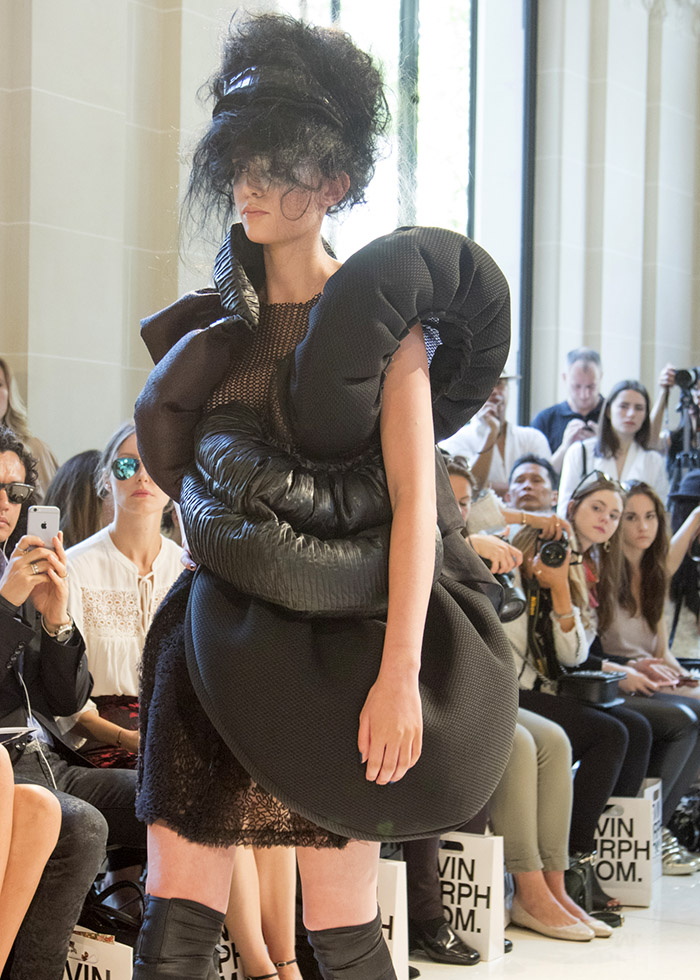 | Fluid black pieces contrasted with more bulbous confections in the new couture collection |