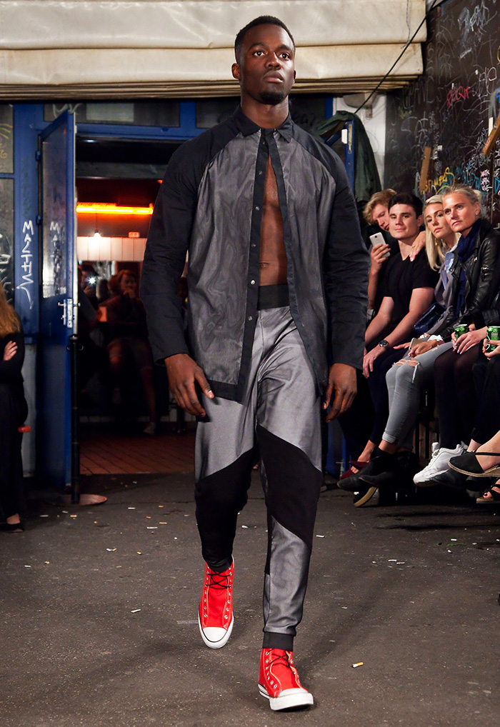 Kunz's SS17 Soul Inflamed collection shown in Denmark's capital during Copenhagen Fashion Week, uses jersey, mesh and neoprene with dramatic color-blocking in black, white and red, heightening the effect of well-tailored bomber jackets, leather coats and cropped pants plus sinous sportwear. Kunz likes to imagine he is dressing the urban warrior with asymmetrical designs, the line and cut metaphors for African tribes' war paint and scars.