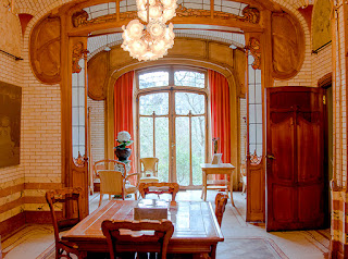 The architect's former house and studio situated in the St Gilles district in Brussels is now the Victor Horta museum and embodies the essence of his Art Nouveau philosophy. It was built between 1898 -1901 and has recently been restored. Horta not only designed the architecture of the building but created every detail of the interiors. Each room is full of his experimental use of new forms and materials from the swirling designs of the mosaic floors and the wall coverings in marble, bronze and silks along with the vivid and curvilinear stained glass panels, plant-like light fittings, vases, carved wooden furniture and the fine bronze door handles and hinges with dynamic shapes.