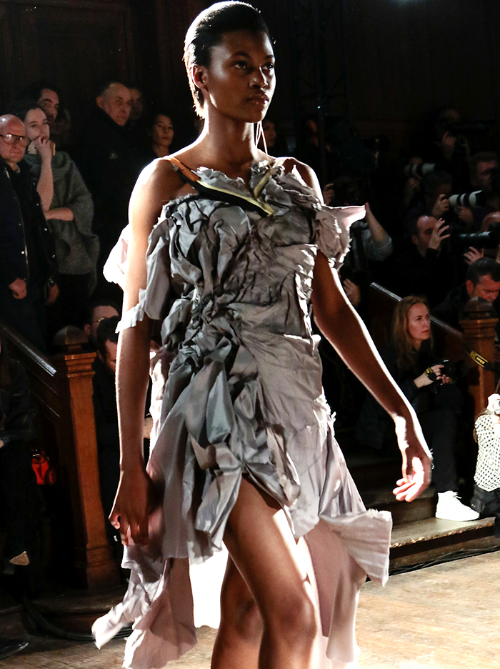 During the show, a large screen projection, flashing lights and loud metallic sounds were meant to disturb the audience while the models filed past in a collection of distressed, asymmetrical and yet sporty creations. The aim was to create a sense of apocalyptic disorder suggesting that chaos is needed for creativity and innovation to flow.