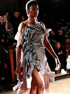 On the catwalk there were black, shiny vinyl looks, dresses with ruches and asymmetric cuts, and Bösch and Gadient's experiments with deconstructing tartans and plaids.