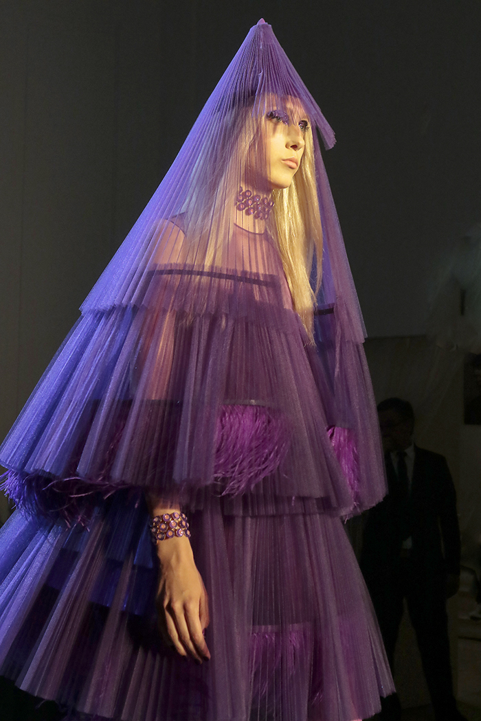 | Fine purple pleats form transparent layers for this fairytale creation |