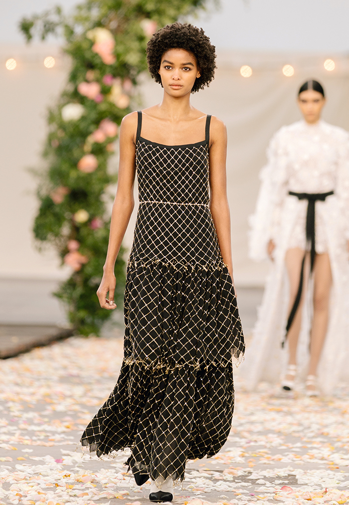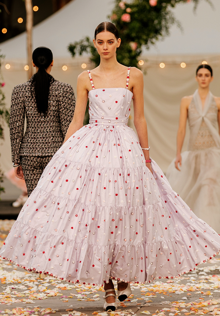 This SS21 couture collection also included tiers of flounced crêpe georgette in pale pink and a bolero worn with two-tone Mary-Jane shoes with a double strap, like tango dancers wear. This season's Chanel booties were designed with wedge heels decorated with a golden, quilt-like grid. "I'm always thinking about what women would like to have in their wardrobe today," comments Viard.