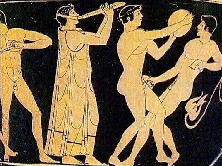In one vase painting from the 5th century BCE, a group of athletes trains while a musician plays the aulos, a type of ancient pipe instrument.